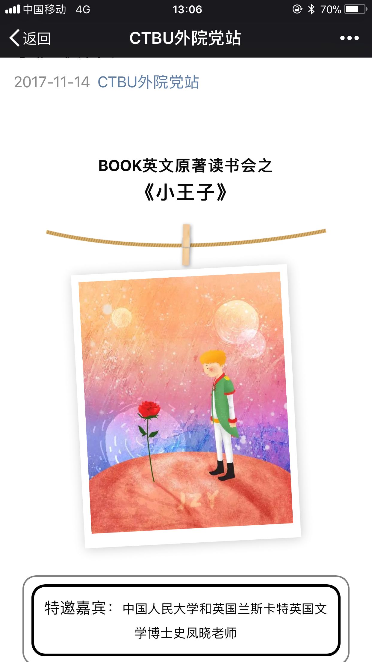 本期读书会选读的书目是由著名翻译家柳鸣九翻译,法国作家安托万·德·圣·埃克苏佩里的作品《小王子》的英文译本。本期线下读书分享会邀请到公司新葡的京集团35222vip教师、中国人民大学与英国兰卡斯特大学联合培养文学博士史凤晓老师参与活动。分享会在《小王子》英文原版电影经典片段拉开了序幕,史凤晓老师首先分享了她的阅读经历、感受和英文原著阅读的方法和技巧,同学们也就自己的阅读体会、阅读难点和困难进行了交流。分享会上,史老师对同学们在阅读英文原著中遇到的问题进行了解答,同学们也就书中经典桥段畅谈了感受,对一些语法问题和行文技巧进行了沟通和分享。整个读书会的氛围非常热烈和融洽,与会者徜徉在英文原著的意境中,感受到英文阅读的魅力,体会中西文化的差异,激发了来自不同专业的同学们对英文阅读和英语学习的兴趣和动力。