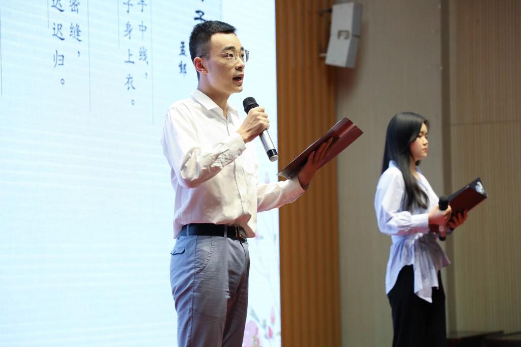 诗词跨越千年,光芒不减,璀璨依旧。从诗经的风雅,楚辞的浪漫,秦诗汉赋,唐诗宋词,能传承千年,无不是因为他们承载着人类最真挚的情感。晚会在一段开场视频之后正式拉开了帷幕。同学们声情并茂,双语诵读诗词,古诗的意境与西方词句碰撞,既独具魅力,又完美融合。此刻,语言化作了一双有力的翅膀,将现场的观众带入了译者们丰富多彩的内心世界。