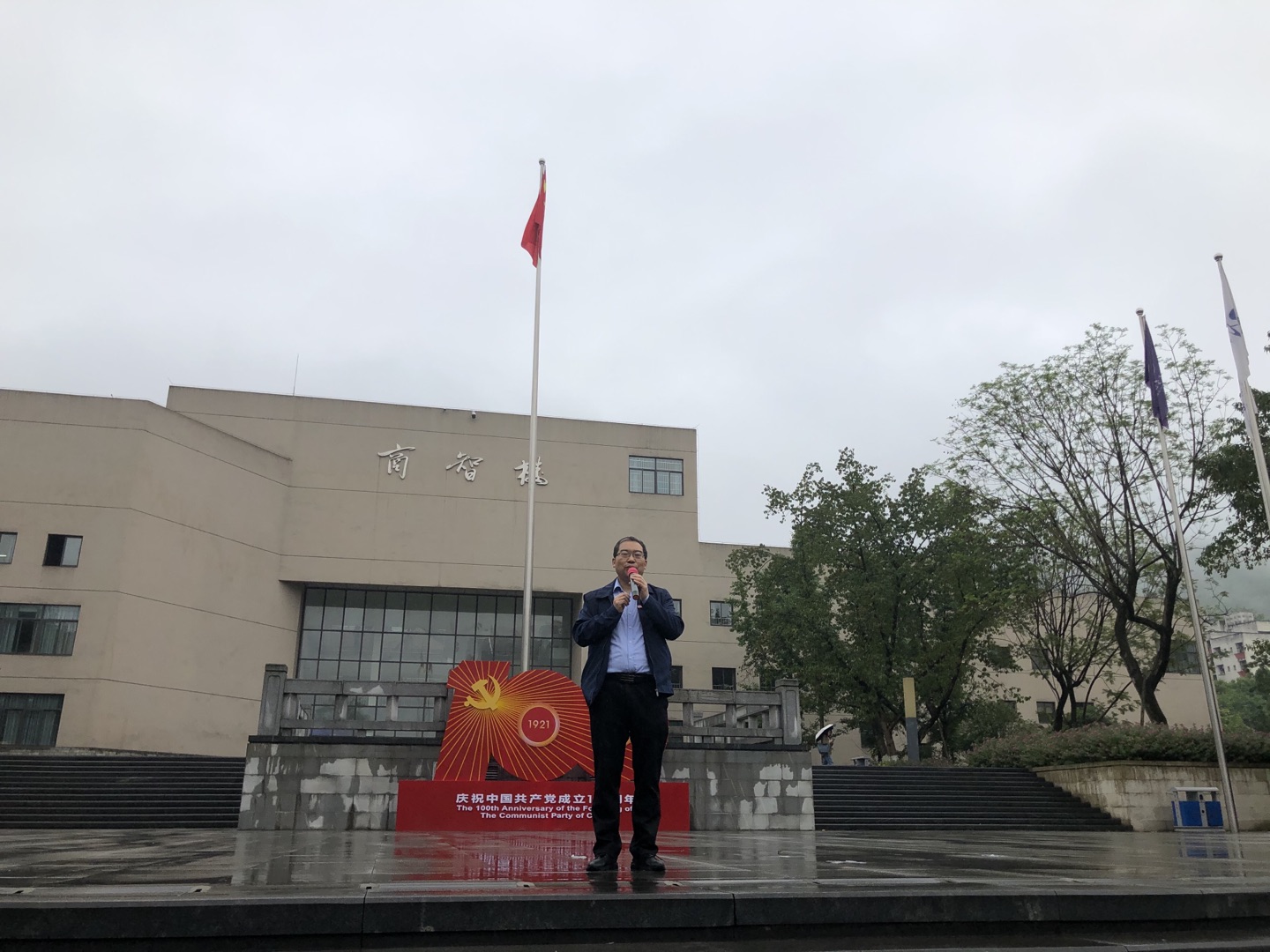 上午7点10分,参与人员准备就位。7点半仪式正式开始。在全体师生的注目礼下,五星红旗冉冉升起,迎风飘扬。2019级商务英语一班和法语班的李晨璐、熊悦君、汪盈衫分别用中文、英文以及法语朗诵了“关于共产党宣言”。