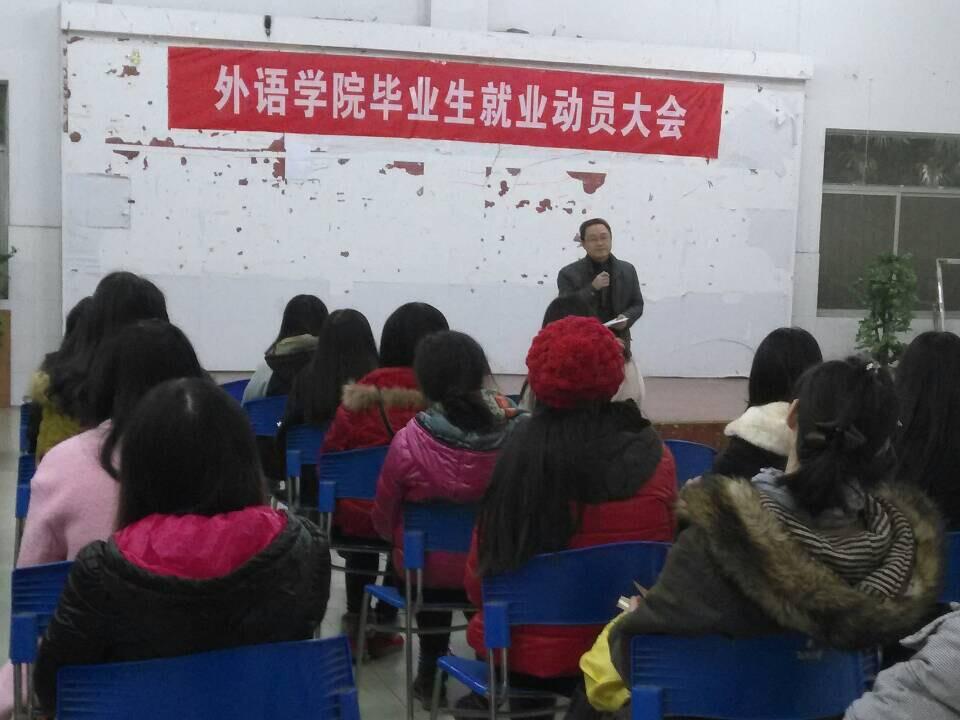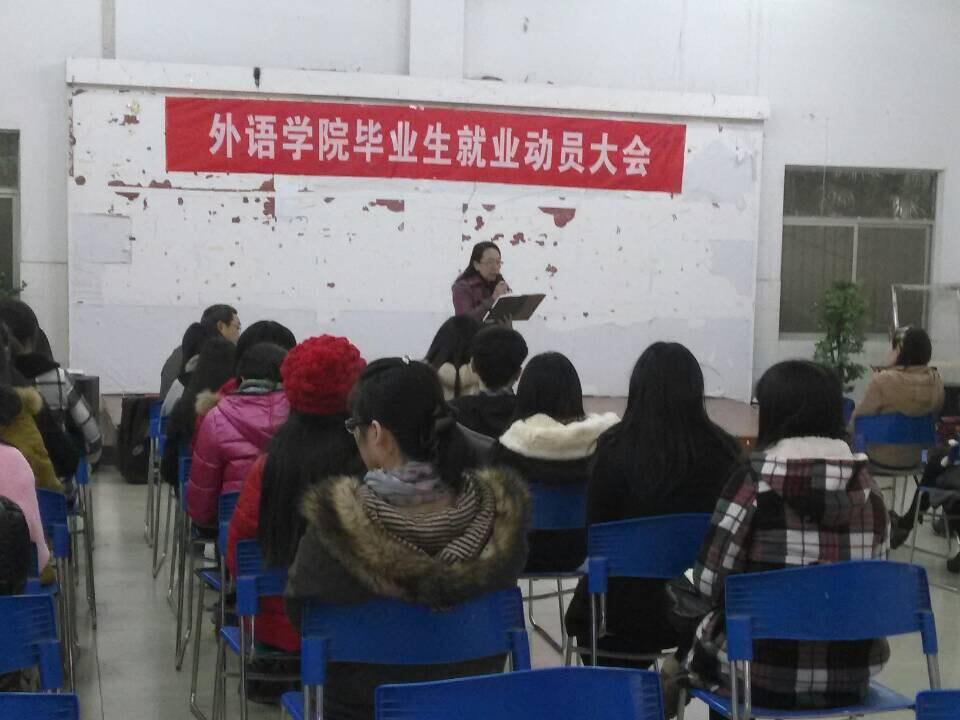 2014年12月22日下午4点,2011级毕业生就业动员大会在外语活动中心隆重召开。此次就业动员大会是公司通过深入调研目前毕业生的就业心态、就业状况以及就业中出现的问题,再一次对毕业生进行全面而客观的就业指导。