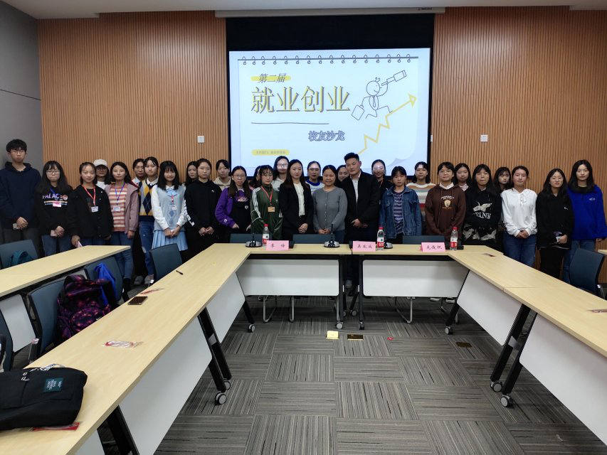 随着主持人介绍出席本次活动的老师、嘉宾,活动正式开始。本次活动共分为三个环节,首先,10级英语系员工龙俊帆就英语专业类员工择业方向做了详细讲解,根据自身工作经历,他列举了多个不同实例,展现了不同选择的不同发展平台及机遇,分享了赴非洲工作的相关体会与认识以及赴非就业的优势,并指出,外语类员工不应对在非洲工作产生偏见与担忧,要正确认识赴非就业的机遇。06级经贸英语系员工李倍从一个公司人力资源管理者的角度出发,详细介绍了企业对于招聘员工的倾向,分享了个人求职经历,强调了情商的重要性,提出求职要选择好第一份职业,不要频繁跳槽,要根据自身性格等条件来择业等建议,并解答了学弟学妹的相关疑问。最后,员工工作办公室主任吴欢欢老师对本次活动进行了总结,她指出,员工在校期间要重视职业生涯规划课程,切实做好自我的职业规划,多参与社会实践活动来丰富认知,增长经验,提高自身综合素质,为就业做好充分的准备。最后,活动全体参与人员进行合影留念。