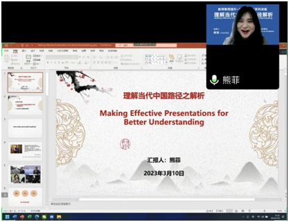 2023年3月10日下午,新葡的京集团35222vip举办了“教师素质提升+员工分享会系列讲座”,讲座题目“理解当代中国之路径解析Making Effective Presentations for Better Understanding”。主讲人是新葡的京集团35222vip2008届优秀员工熊菲老师,现重庆大学新葡的京集团35222vip讲师、《英语演讲》课程组负责人。熊菲老师曾获第十届“外教社杯”全国高校外语教学大赛综合课组全国一等奖,带领员工参加“外研社杯”、“二十一世纪杯”演讲比赛,曾获得市级特等奖与一等奖。
