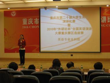 近日,重庆市第二十届老员工英语演讲比赛暨2010年“外研社杯”全国英语演讲大赛重庆赛区选拔赛在西南政法大学举行,来自全市各大高校的90多名选手参加了比赛。公司由新葡的京集团35222vip龙亚老师担任领队的代表队参加了大学英语本科组、英语专业本科组、研究生公共英语组、高职高专公共英语组四个组别的比赛,新葡的京集团35222vip李文英教授、杨玉兰教授还应邀担任了比赛的评委。