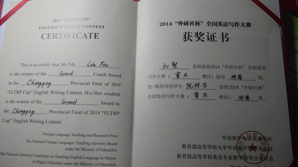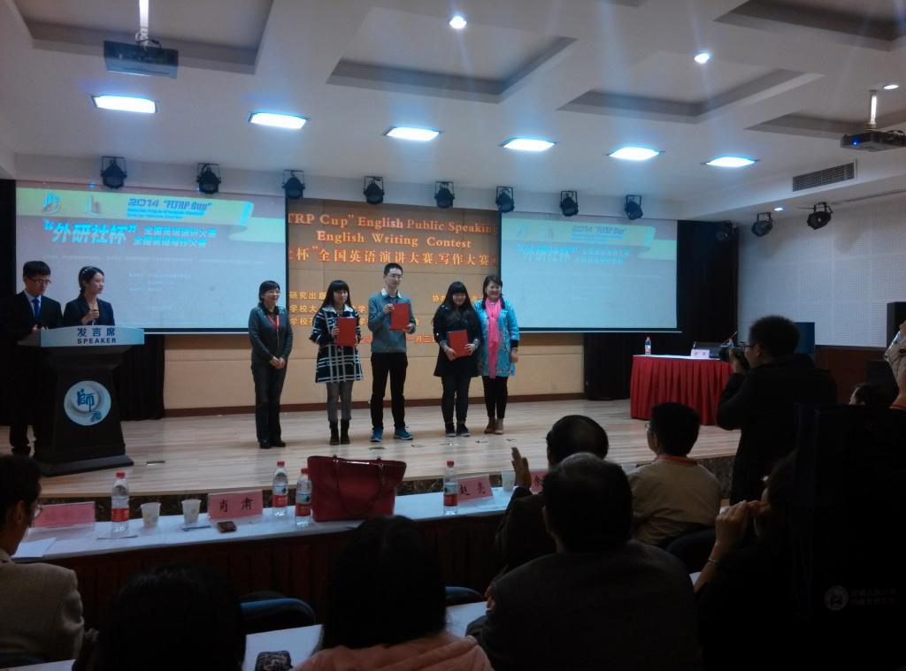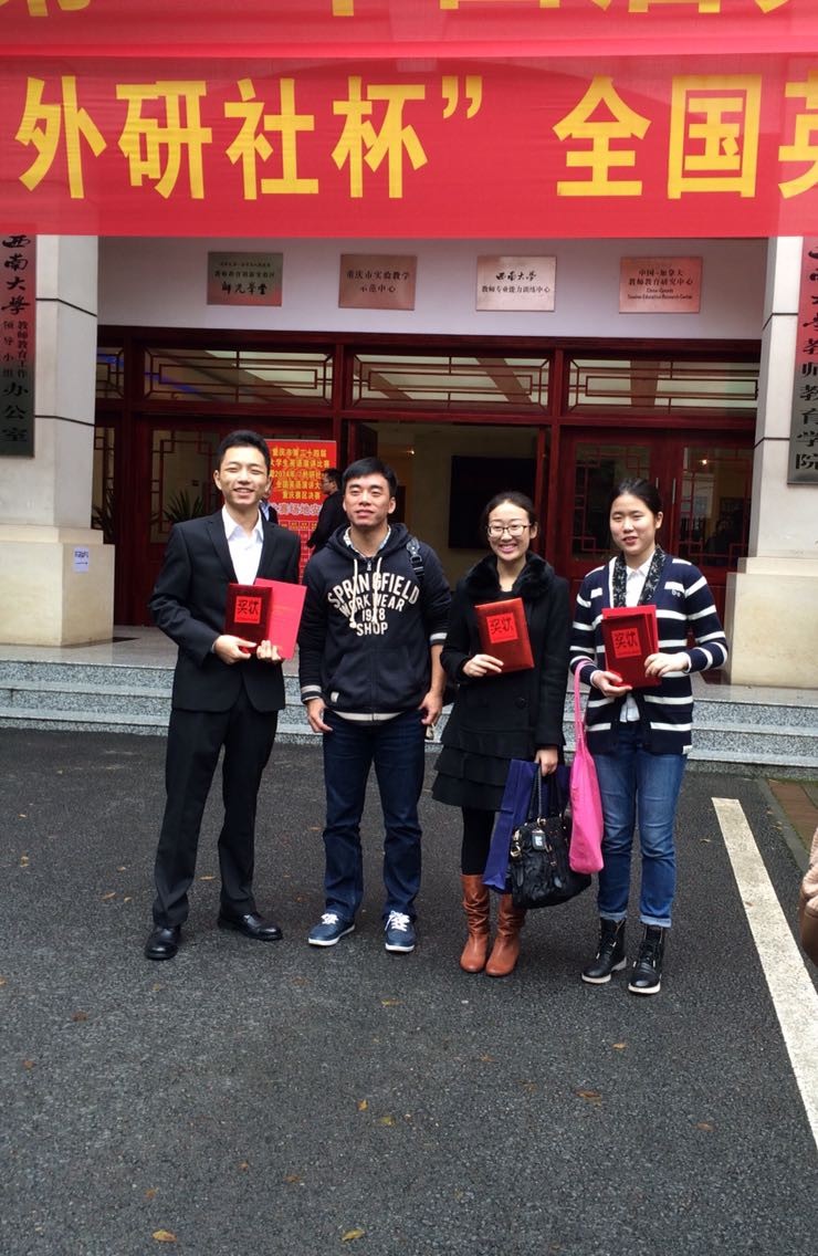 经过激烈角逐,选手们克服压力发挥出色,成绩斐然。​新葡的京集团35222vip倪晨岑获得2014“外研社杯”全国英语演讲比赛、写作大赛重庆赛区选拔赛写作比赛专业组特等奖,将代表重庆市高校参加今年12月份在北京举行的全国总决赛;杨丽、杨思卿、冯颖分别获得相应组别二等奖;杨雨双荣获三等奖。