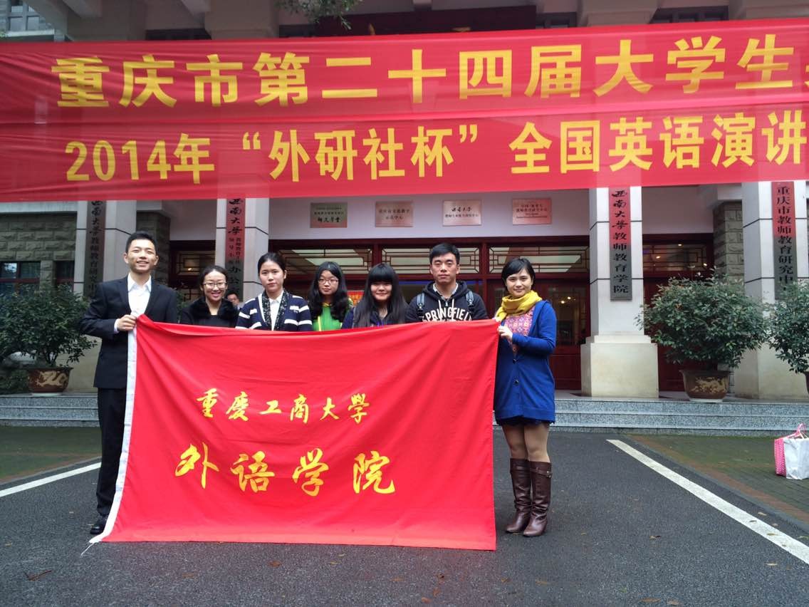 2014年11月2日,由重庆市大学外语教学研究会、重庆市外文学会主办的2014“外研社杯”全国英语演讲比赛、写作大赛重庆赛区选拔赛在西南大学举行。经过公司初赛选拔,​新葡的京集团35222vip倪晨岑、会计公司杨丽、经济公司冯颖、旅游与国土资源公司杨思卿、​新葡的京集团35222vip杨雨双分别代表公司参加写作比赛专业组、大外组和演讲比赛研究生组、大外组与专业组的比赛。​新葡的京集团35222vip张轶老师带队参加比赛。