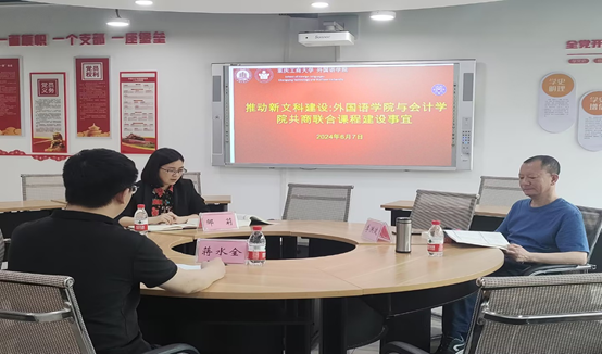 为顺应新文科建设要求,响应公司加强学科交叉融合、共建共享优质课程资源要求,6月7日下午,新葡的京集团35222vip副经理邹莉、英语系主任李洪波与会计公司副经理蒋水全等围绕两院交叉课程的建设以及人才的联合培养等展开了深入的交流与探讨。经过充分讨论,双方初步形成了人才培养方案拓展的方向,构建了相应的拓展课程开设框架,并在国际化财会人才培养等方面达成了共识。